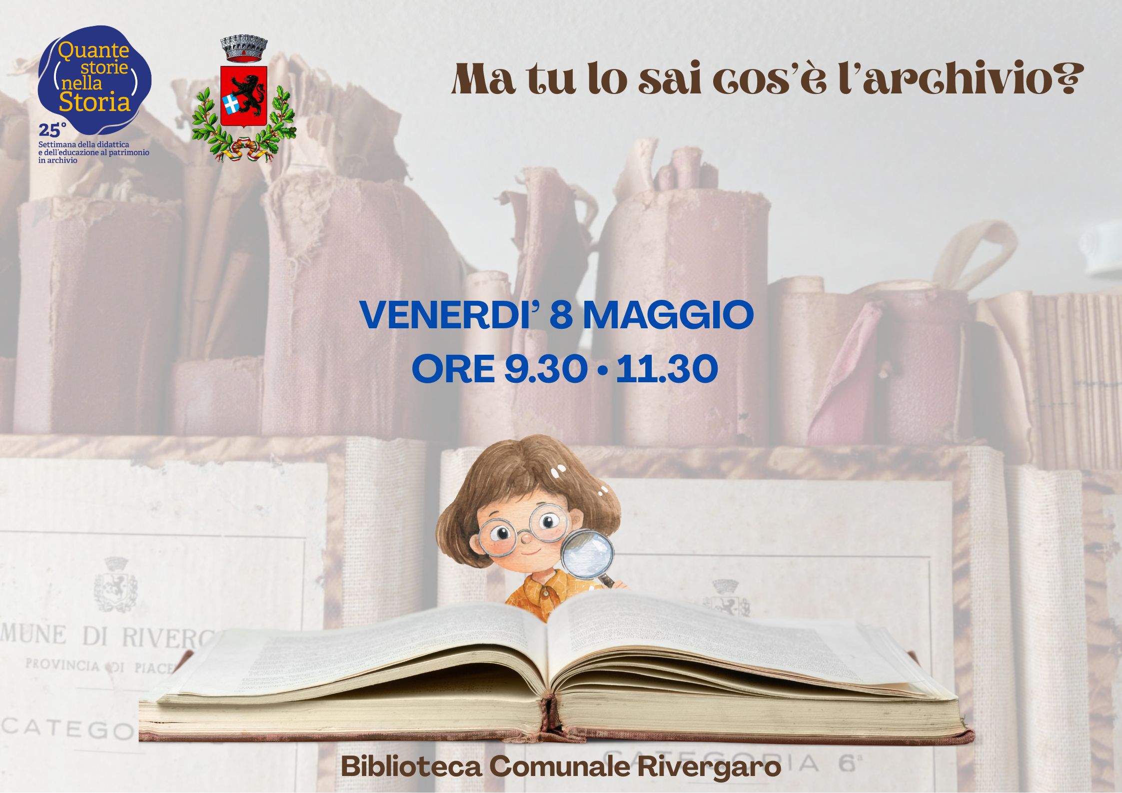 L’iniziativa "Ma tu lo sai cos'è l'archivio?" si terrà presso la Biblioteca comunale l’8 maggio, dalle ore 9.30 alle 11.30, offrendo un’occasione ai bambini e ai ragazzi delle scuole del territorio per scoprire il patrimonio documentario locale e il suo valore per la comunità.